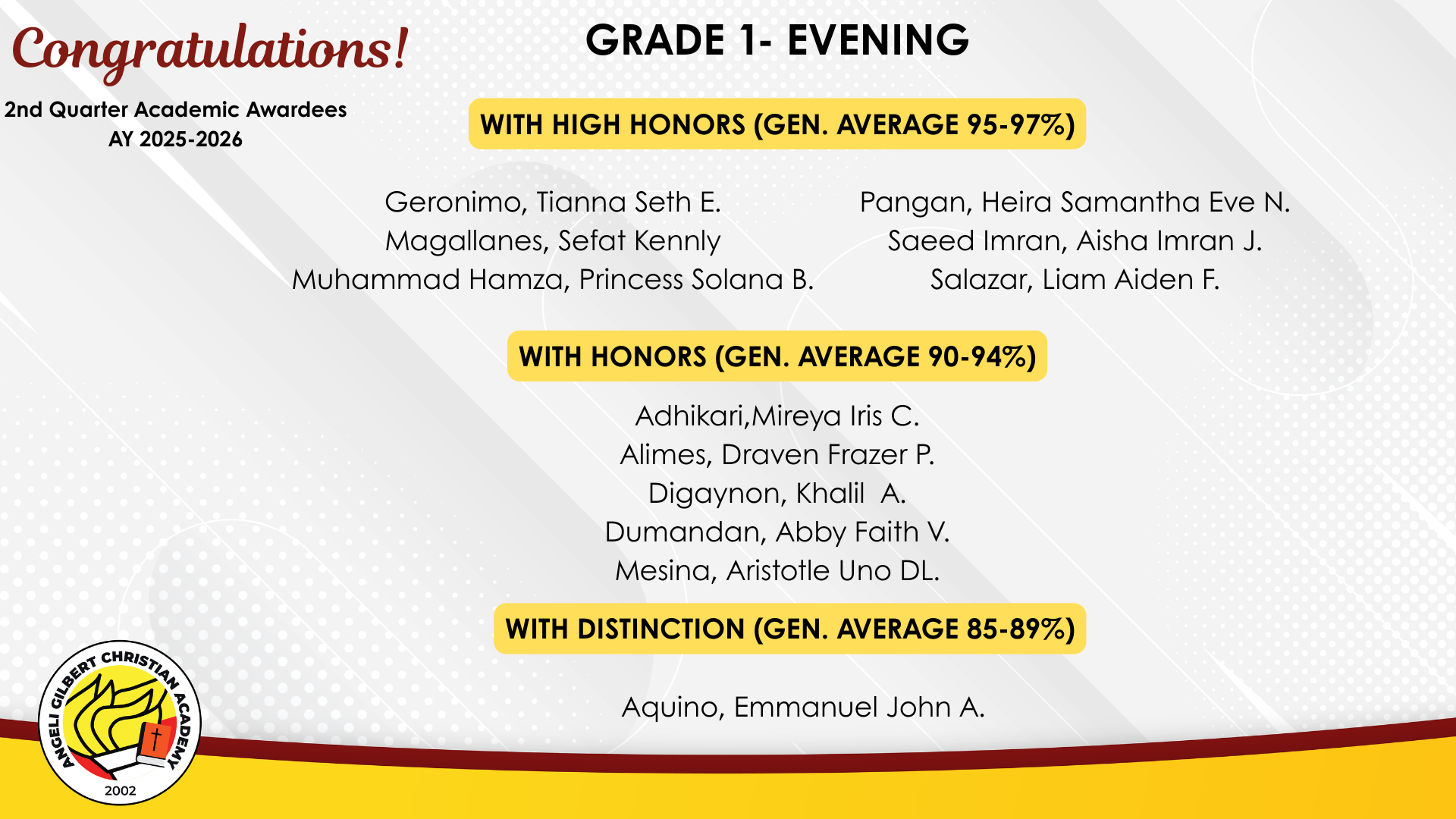 Grade 1 - Evening Class Awardees