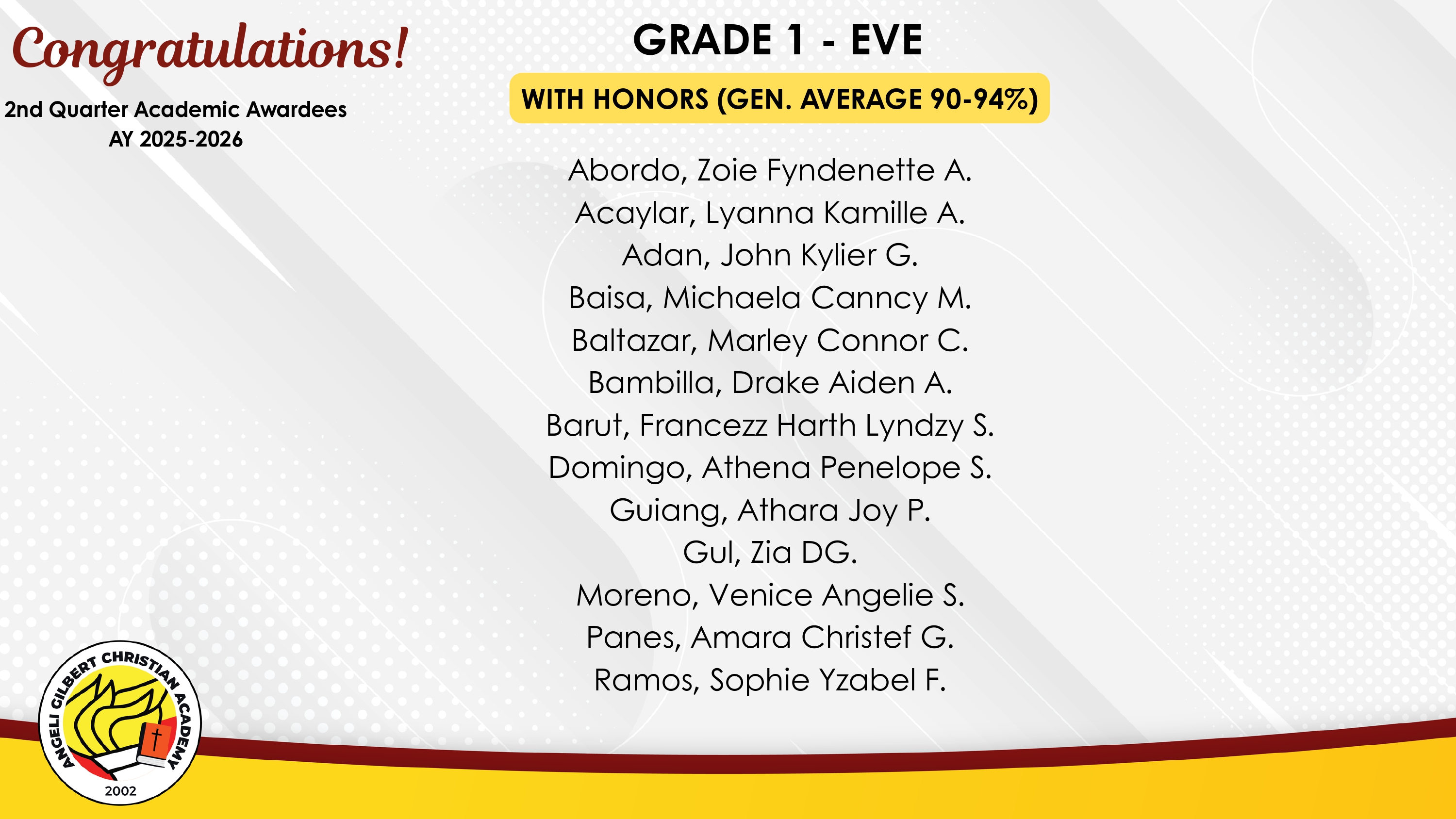 Grade 1 - Evening Class Awardees